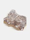 Experience the splendor of hand block printing with ease using this DIY tool. Crafted from jamun wood, this printing block empowers craft enthusiasts and experimental artists to explore patterns and designs, infusing vibrancy into plain apparel. Originating in the 12th century milieu of the Indian city of Rajasthan, the art form of block printing is renowned for its magnificence. Sourced from a Delhi-based supplier specializing in handicrafts, this handmade offering is meticulously carved, featuring intricate motifs. Delight in creating beautiful patterns with captivating colors, all within reach with just a block.