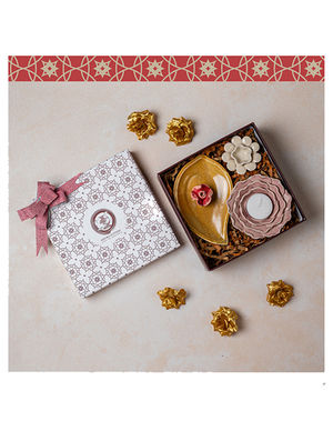 Introducing this thoughtfully curated collection perfect for gifting to your loved ones. This elegant set includes a beautifully crafted tea light holder, an incense stick stand (agarbatti), and two exquisite diyas. Each piece is handmade with care, reflecting the timeless charm of traditional Indian pottery. The warm glow of the tea light and diyas creates a soothing ambiance, while the incense adds a touch of tranquility to any space. Ideal for festive occasions or special moments, this Giftbox brings warmth, elegance, and a touch of serenity to your home and heart.