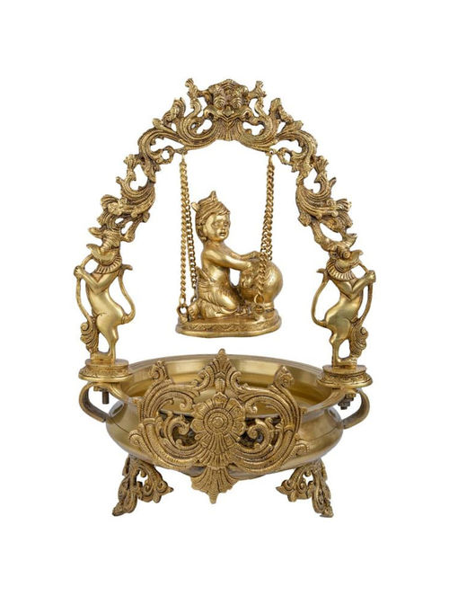 This exquisite handmade brass Indian puja Laddoo Gopal idol murti, set on a swing, is crafted by skilled artisans from India. Adorned with traditional symbols of good luck, it is designed to attract wealth and happiness. The Uruli, a Vastu element, serves as a remarkable addition to both home and workplace decor. In Vastu, water symbolizes wealth, and the flow of water signifies the flow of wealth. Therefore, placing Uruli or other decorative items in a space is considered auspicious. It can be placed in the Pooja room alongside idols or in the living room, complemented by other decor pieces and interior accessories.
