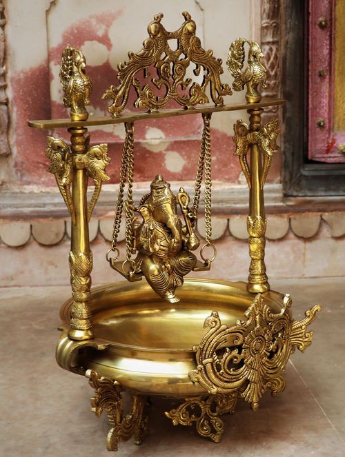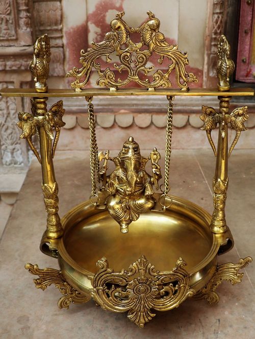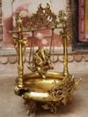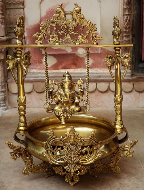 This Urli, made of high-quality brass, is adorned with hanging bells and nine Oil Lamp holders around it with majestic lord Ganesha in his blessing posture sitting on a jhula.
