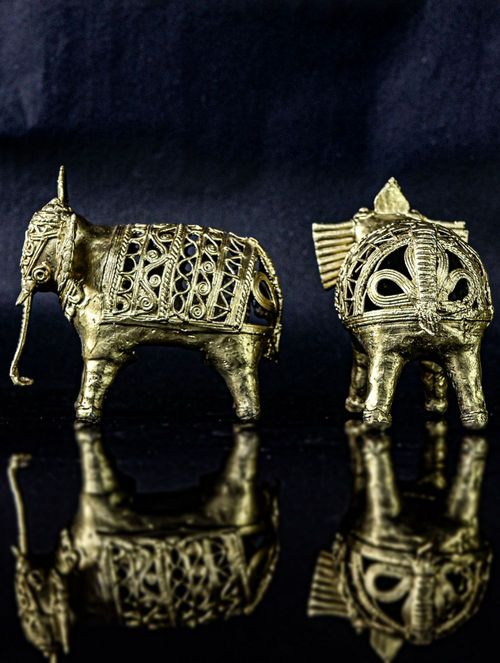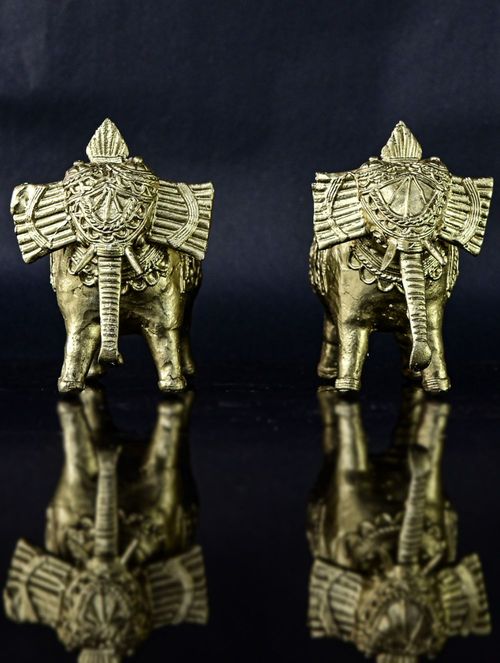 Enhance the aura of traditional elegance in your home decor with our exquisitely crafted Dokra Elephant Pair. Meticulously fashioned by skilled artisans employing the time-honored Dokra metal casting method, each piece radiates intricate detail and unparalleled uniqueness. Ideal for adorning shelves, mantels, or desks, this Elephant Pair is an indispensable addition for aficionados of traditional Indian art and culture.