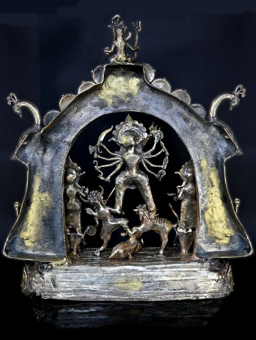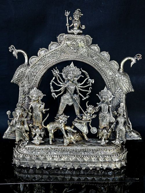 This exquisitely crafted portrayal of Goddess Durga and her divine family not only embodies the essence of love and harmonious unity but also serves as a testament to the profound heritage of its craft. Dokra, bearing the name of the esteemed Dhokra Damar tribe, revered as the custodians of metalwork in West Bengal, holds within its intricate design the echoes of a storied past. Rooted in the ancient traditions of the lost-wax casting technique, dating back to the illustrious era of the Harappan civilization, this art form seamlessly melds timeless grace with a contemporary allure. A true masterpiece, it promises to imbue your collection of artifacts and decorative pieces with an unparalleled sense of refinement and sophistication.