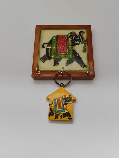 4X4-inch Hand painted Teak wood & Marble stone wall hanging Key holder