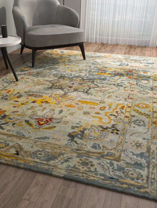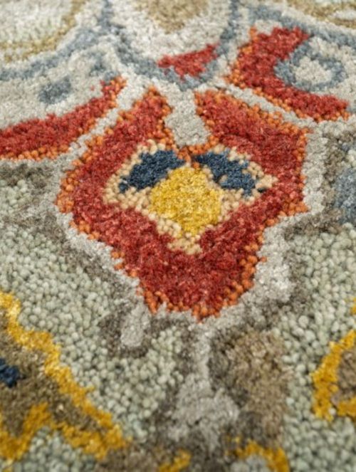The Citrine collection is an assortment of distressed Old World patterns reinterpreted for modern design. The hand-tufted Cristobol rug showcases a center starburst medallion, accented by striking and vibrant hues of blue, yellow, red, and orange. Made of wool and rayon made from bamboo, this timeless rug boasts an ultra-soft feel and elegant, subtle sheen.