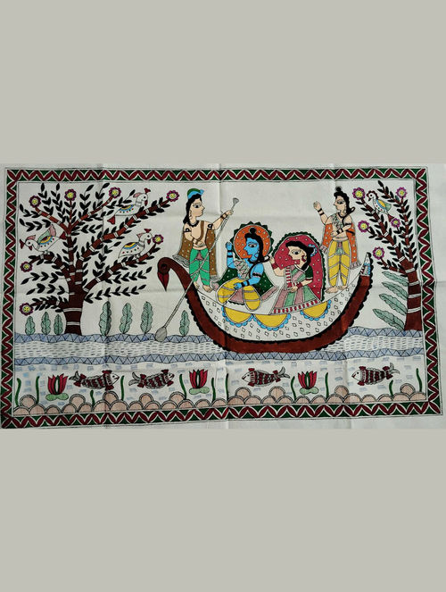 This painting depicts Lord Ram blessing Kevat, a boatsman, who had taken Rama, Sita, and Lakshman in his boat and crossed the Ganges at the time of exile. Bring home this unique work by Antara Verma. Antara is a talented artist from Bihar, well known for Madhubani paintings, an age-old art form renowned for its intricate patterns and vivid colors. Drawing deeply from her cultural heritage, Antara masterfully weaves ancient tales, folklore, and the beauty of nature into her captivating creations. Her unique approach blends traditional techniques with modern sensibilities, creating art that resonates with both contemporary and traditional audiences. With a passion for preserving and evolving this rich tradition, Antara's work has been featured in prestigious exhibitions both in India and abroad, earning widespread recognition and acclaim. Beyond her own artistic achievements, she dedicates herself to mentoring young artists, encouraging them to honor their roots while embracing innovation.