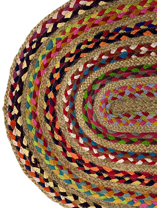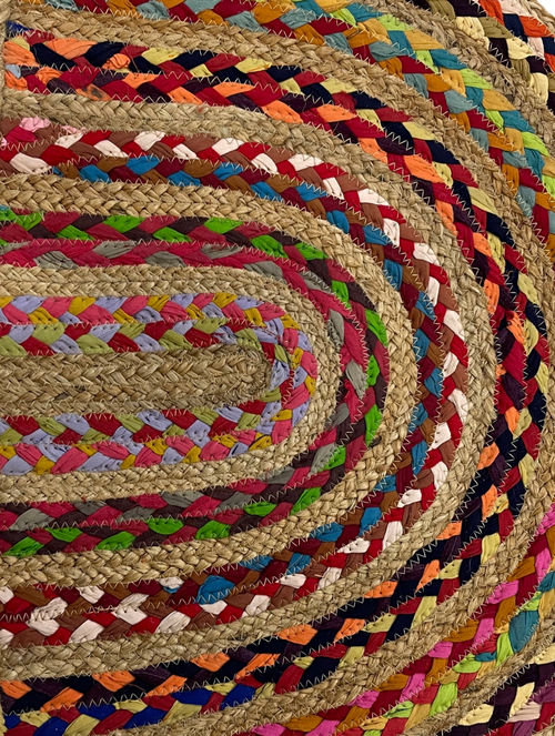 Bring vibrant colors to your doorstep with this recycled braided cotton and jute doormat from Agra. Made of 50% cotton and 50% jute, its rainbow hues and sturdy craftsmanship make it both eco-friendly and delightfully welcoming?a perfect accent for your entryway.