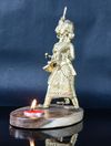 Radiating with historical significance and exquisite craftsmanship, this captivating Lamp-holder with Dokra figurine depicting a tribal couple is meticulously crafted from brass metal. Dokra art is inspired by the Dhokra Damar tribe, renowned traditional metalsmiths from West Bengal. The intricate lost-wax casting technique employed in this art form can be traced back to the Harappan civilization. Combining ancient charm with modern allure, it promises to infuse your collection of artifacts and decor with a unique sense of style and sophistication.