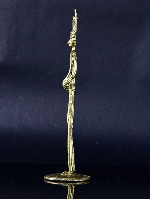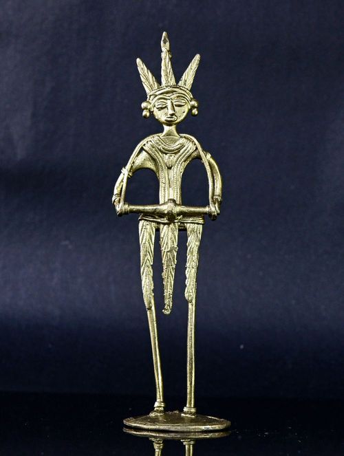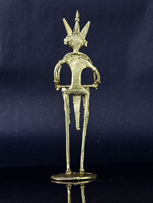 This exquisite Dokra sculpture portrays a tribal man with the traditional madol, meticulously crafted in brass. It makes a splendid addition to any setting, whether adorning your desk or presented as a thoughtful gift. Its intricate details are sure to captivate and spark conversations, while also offering a glimpse into the rich heritage of this ancient craft and the remarkable skill of its artisan creator, perhaps even igniting a touch of inspiration.
