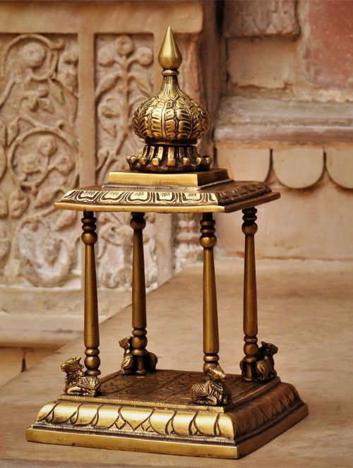 Prayer holds a central position within the household, whether at an individual or familial level. It's a widespread tradition across various religious traditions worldwide to maintain a private shrine at home, adorned with personal idols, sacred texts, and embellishments. Crafted meticulously in pure brass by the artisans, this Brass Temple harmonizes functionality with aesthetic appeal, embodying both practicality and elegance in its design.