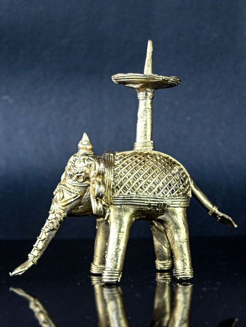 This exquisite Dokra sculpture portrays an elephant with lamp holder on top, meticulously crafted in brass. The term Gajraj represents energy in all its glory. Bring home the majestic Dhokra Elephant and add a touch of royalty to your home. It makes a splendid addition to any setting, whether adorning your desk or presented as a thoughtful gift. Its intricate details are sure to captivate and spark conversations, while also offering a glimpse into the rich heritage of this ancient craft and the remarkable skill of its artisan creator, perhaps even igniting a touch of inspiration.