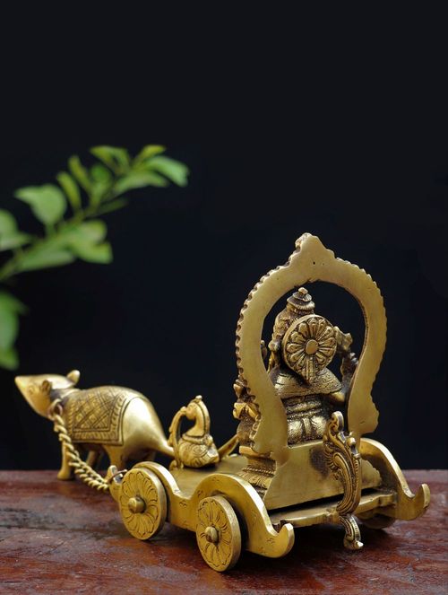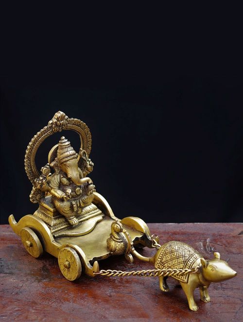 This unique statue of Ganesha in chariot driven by Mushak is a beautiful piece for your decor. Handcrafted on pure brass by the artisans to accentuate your decor with a strong sense of divinity.