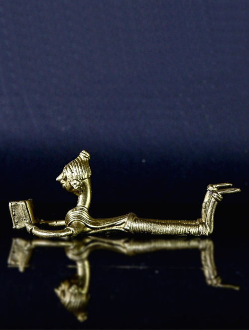 This exquisite Dokra sculpture portrays a tribal girl reading a book lying down, meticulously crafted in brass. It makes a splendid addition to any setting, whether adorning your desk or presented as a thoughtful gift. Its intricate details are sure to captivate and spark conversations, while also offering a glimpse into the rich heritage of this ancient craft and the remarkable skill of its artisan creator, perhaps even igniting a touch of inspiration.