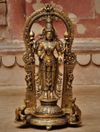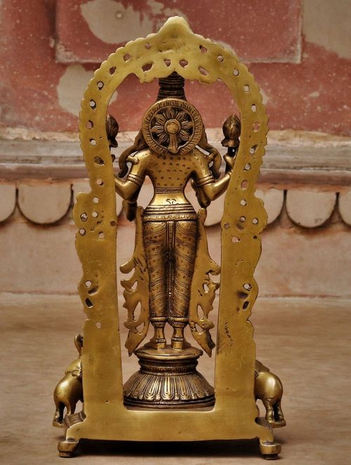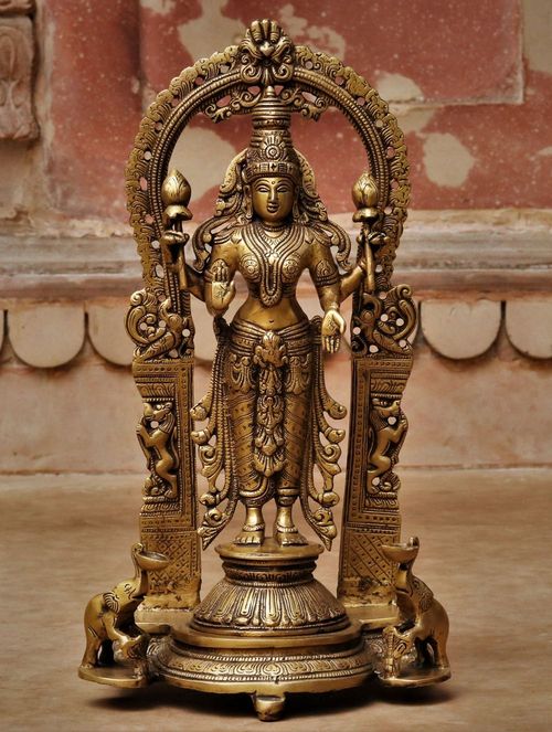 This beautiful brass statue is of Dhana Lakshmi one who bestows financial wealth. In this brass artwork, Lakshmi is seen standing on a pedestal. The rich jewelry Dhana Lakshmi is bedecked in is depicted with intricate carving in the statue. Goddess Lakshmi is seen four-armed. She holds lotus flowers in her two upper hands and her lower right and left hands are in Abhaya Mudra (assurance or granting fearlessness) and Varada Mudra (boon granting) respectively.