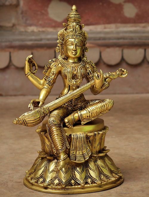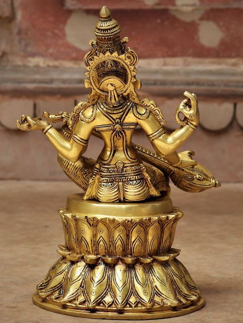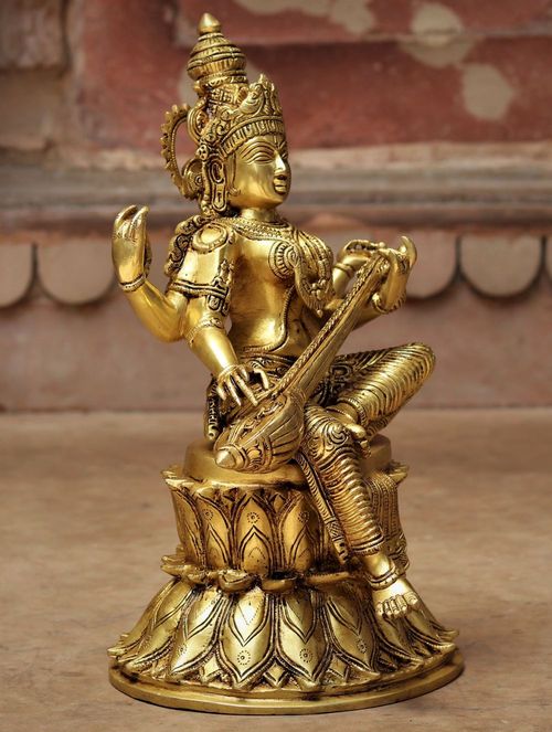 Exclusively handcrafted in traditional form in pure brass with wax technique, the intricate detail of the statue makes it stand apart. Saraswati is seated on a lotus pedestal with her emblems and vina in her hands, symbolizing her superiority over worldly desires. She is the ultimate representation of knowledge and wisdom.