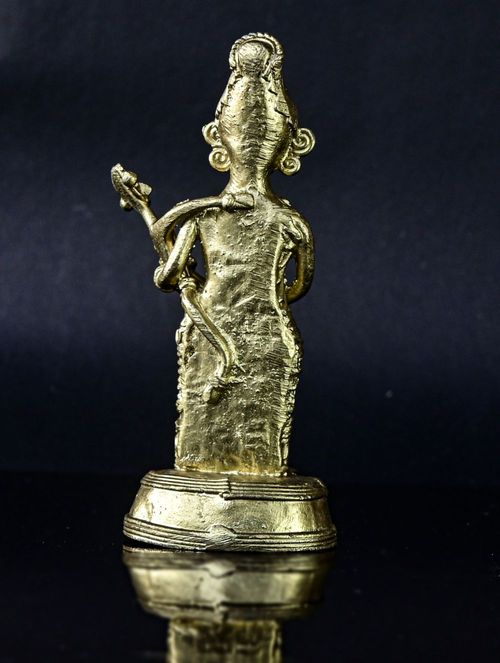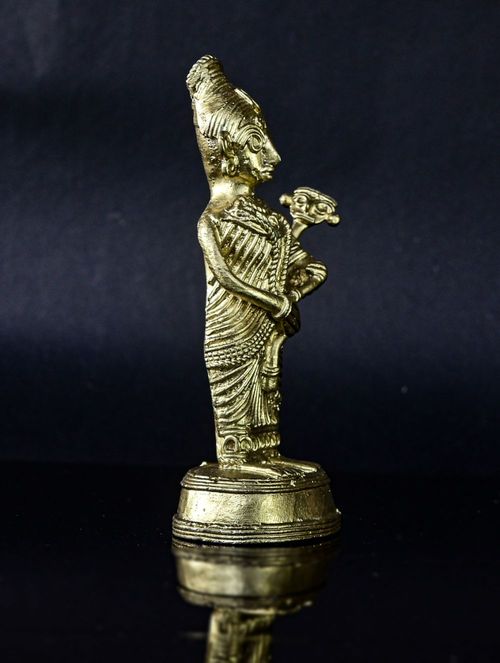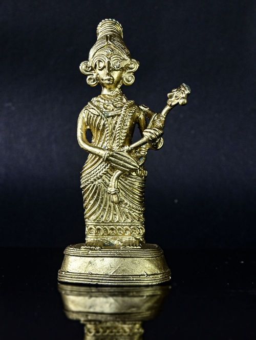 This exquisite Dokra sculpture portrays a tribal mother and child, meticulously crafted in brass. It makes a splendid addition to any setting, whether adorning your desk or presented as a thoughtful gift. Its intricate details are sure to captivate and spark conversations, while also offering a glimpse into the rich heritage of this ancient craft and the remarkable skill of its artisan creator, perhaps even igniting a touch of inspiration.